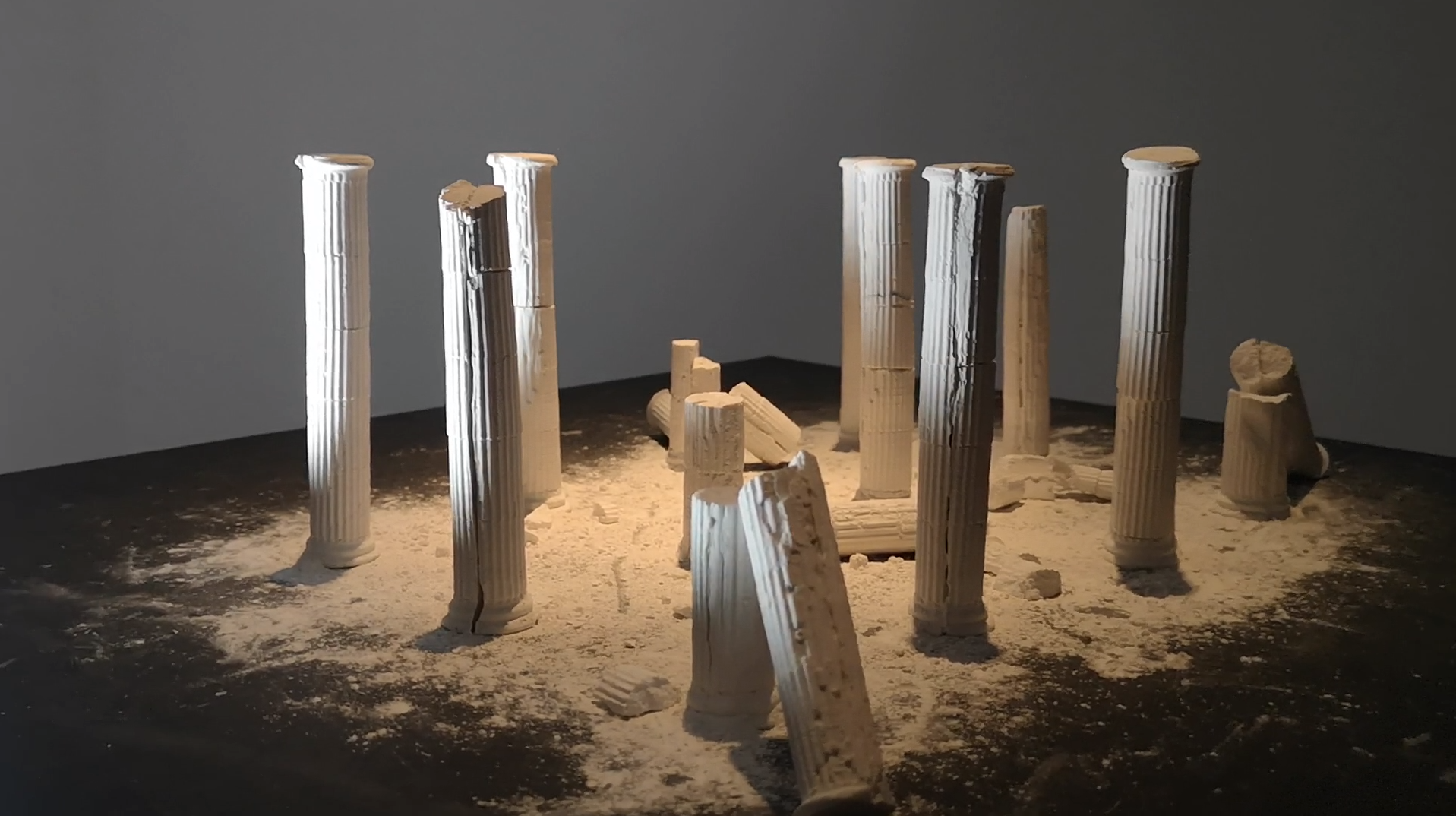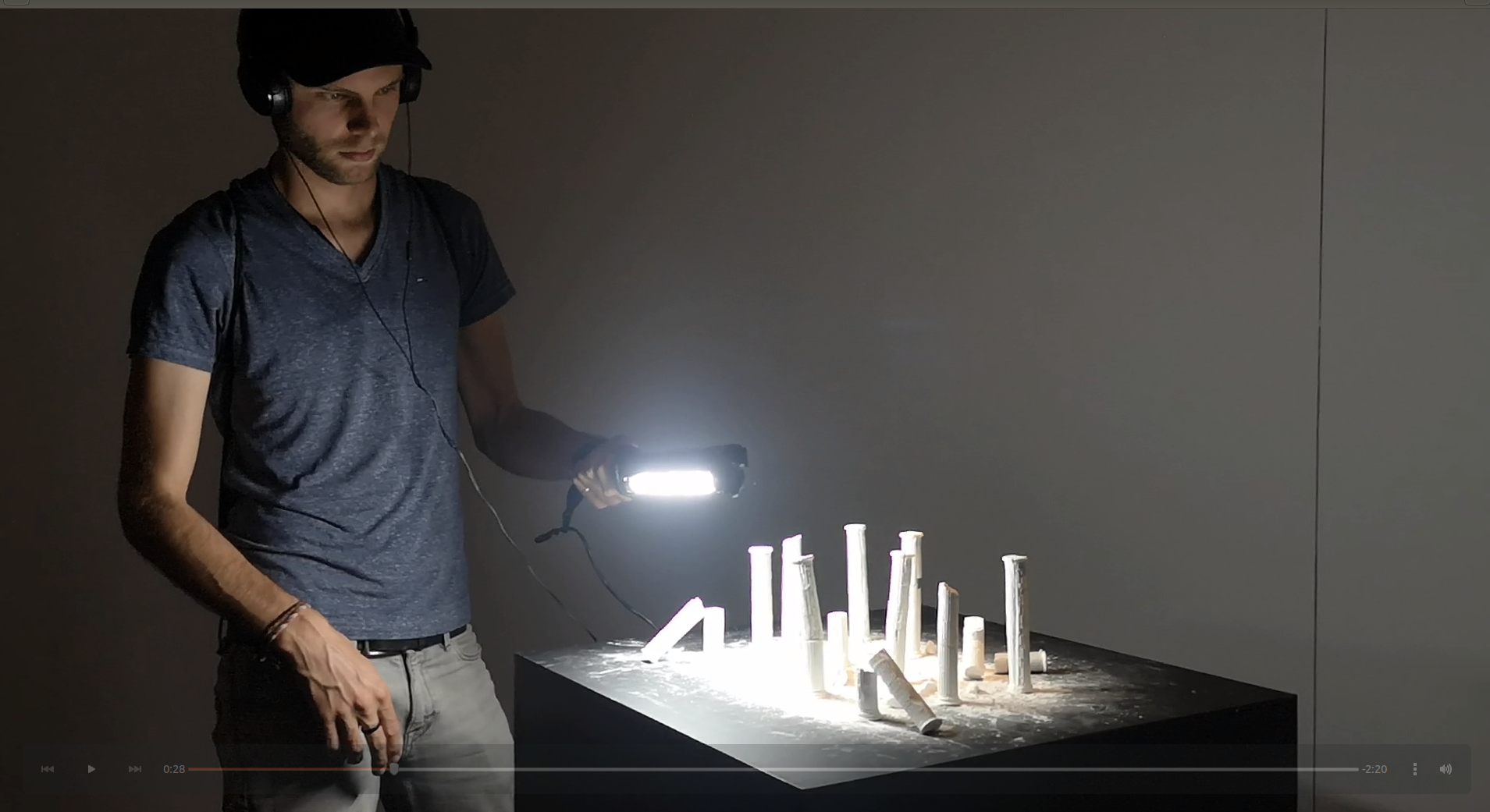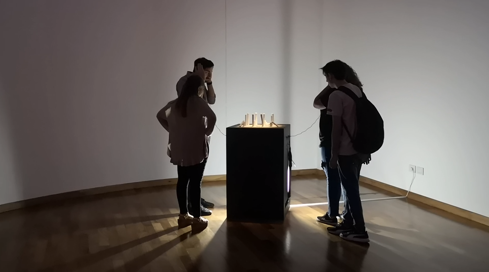 The sound poem declared appropriately by the computational interface of the installation is generated from the sensing, in real time, of electromagnetic waves that recombine neo-classical texts and philosophical texts found within the installation space.